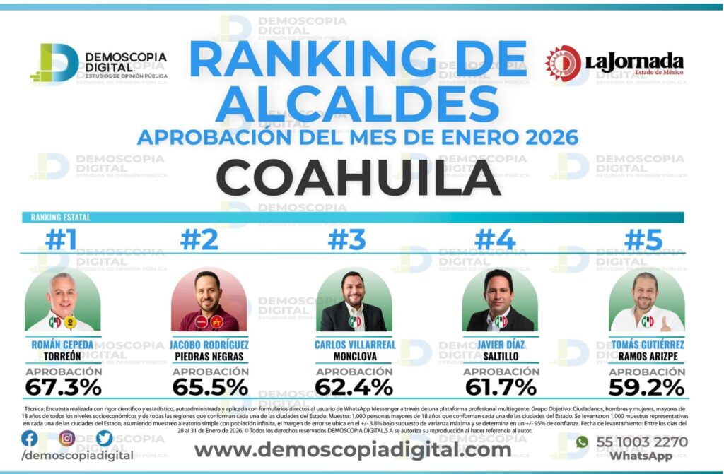 Las cifras corresponden al cierre del mes de enero, periodo en el que el presidente municipal de Torreón se colocó por encima de Jacobo Rodríguez, alcalde de Piedras Negras; Carlos Villarreal, de Monclova; y Javier Díaz, de Saltillo, quienes ocuparon las posiciones subsecuentes dentro del listado estatal.