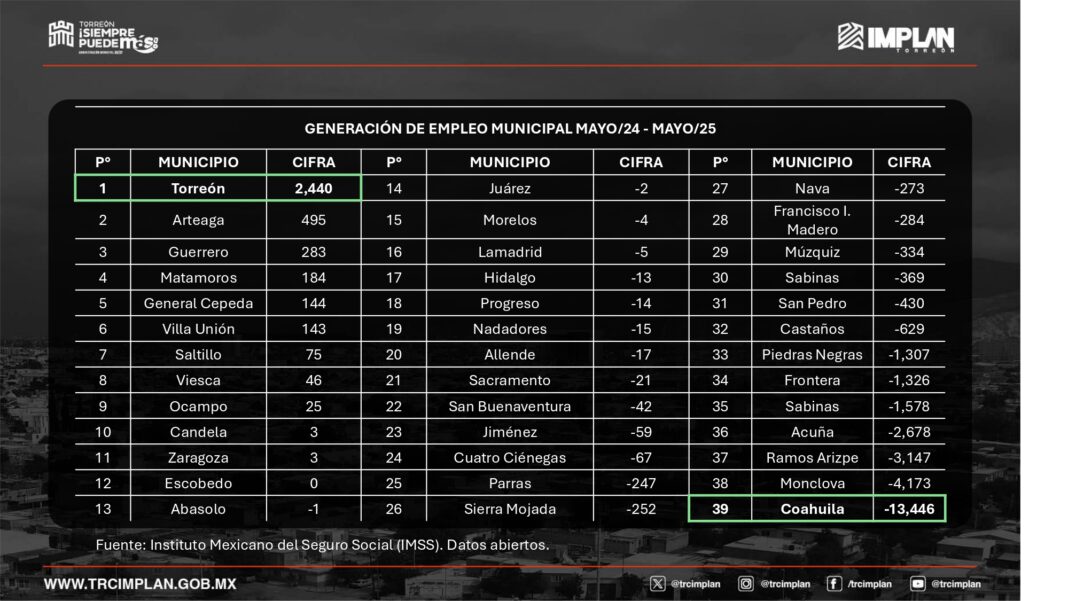 En cuanto a municipios de la Zona Metropolitana, también Torreón encabeza el alza en materia de creación de empleo.