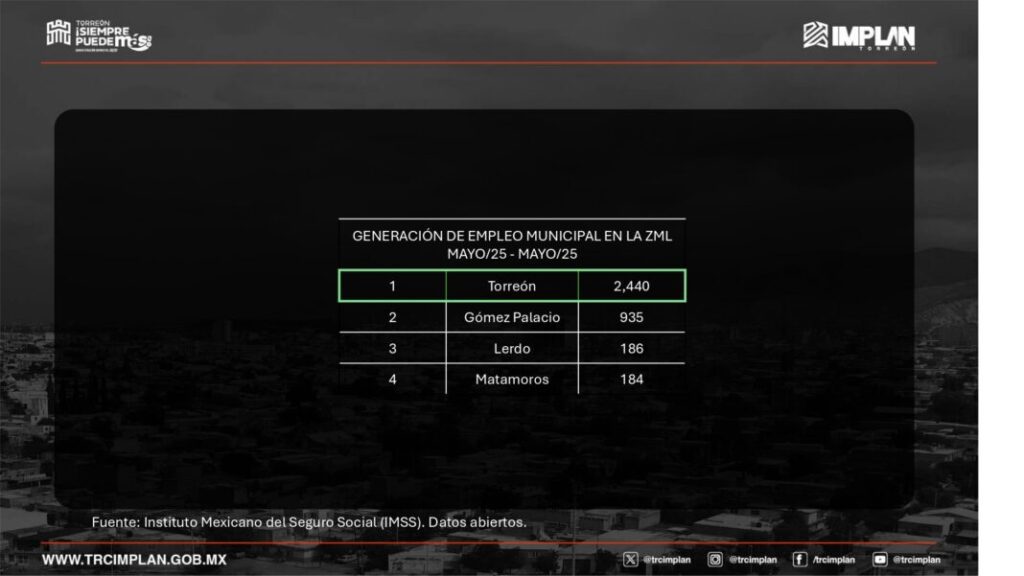 Además, según el IMPLAN, los datos del IMSS muestran una inercia favorable para que Torreón continúe creciendo en materia de generación de empleo para los próximos meses.