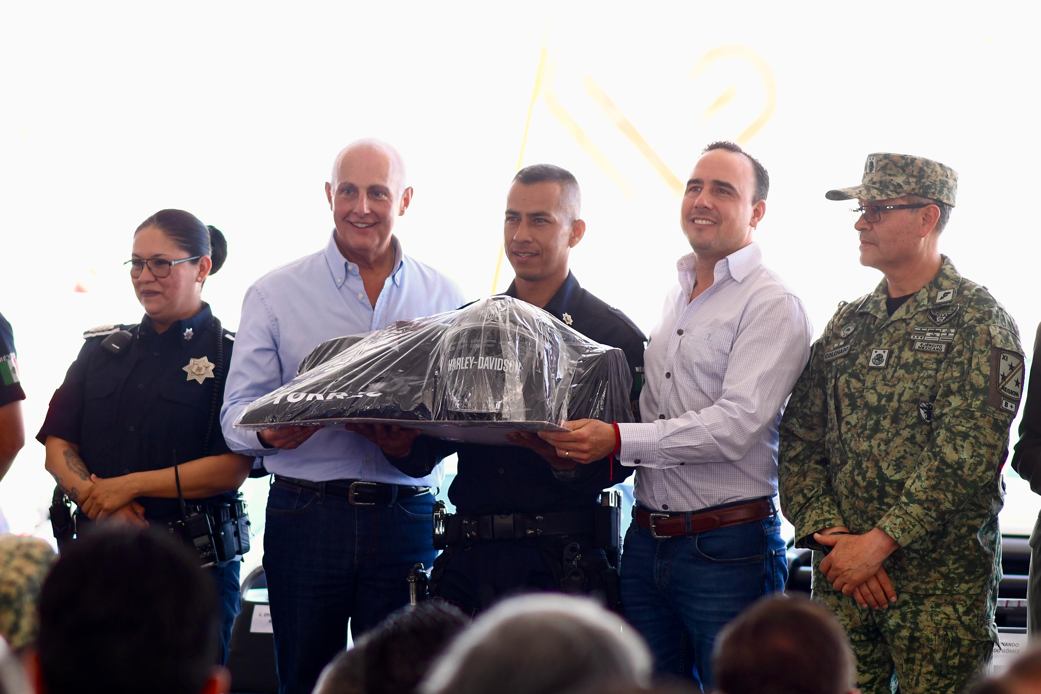 El Alcalde además resaltó que el gobernador Manolo Jiménez es el mejor evaluado y Coahuila la segunda entidad más segura del país, y afirmó que la entrega de patrullas, equipamiento y uniformes es resultado de la coordinación entre Estado y Municipio.