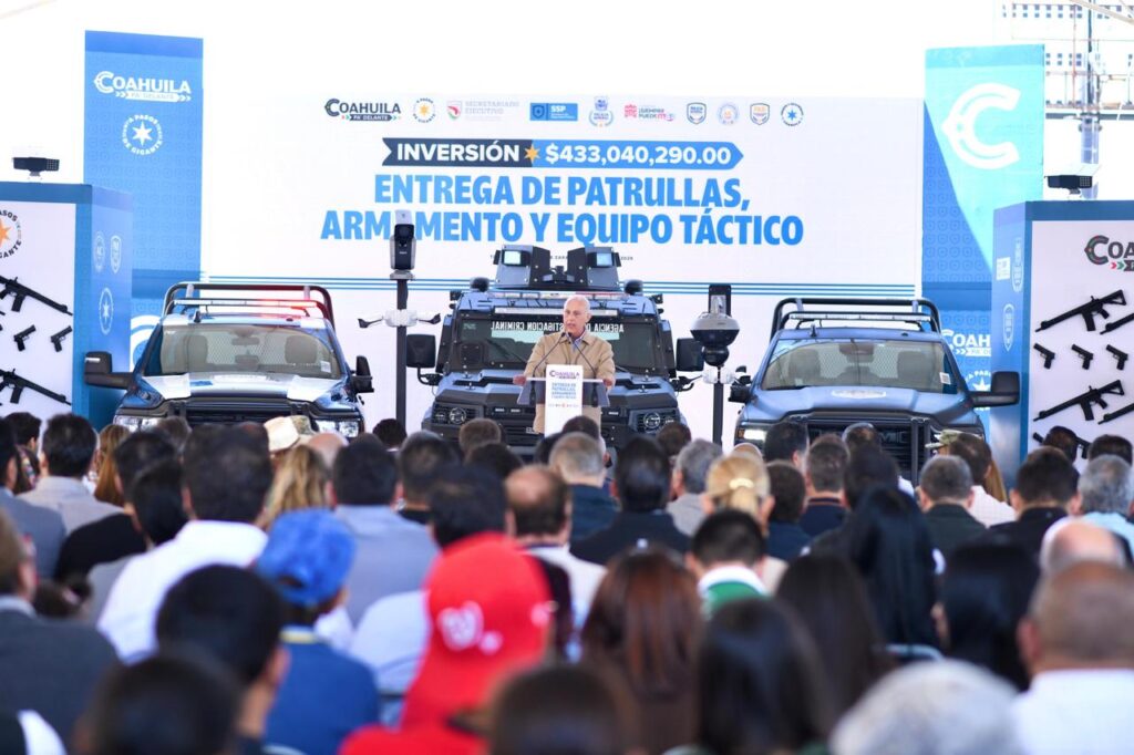 Con una inversión superior a los 433 millones de pesos, este jueves el gobernador Manolo Jiménez Salinas, acompañado por el alcalde Román Alberto Cepeda González, así como de presidentes y presidentas municipales del Estado, realizó en Torreón la entrega de patrullas, equipamiento táctico y de inteligencia, así como uniformes y armamento a las diferentes corporaciones de seguridad en Coahuila.