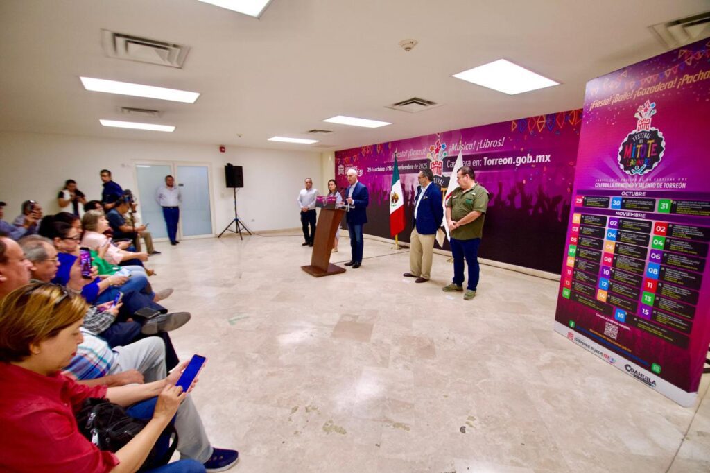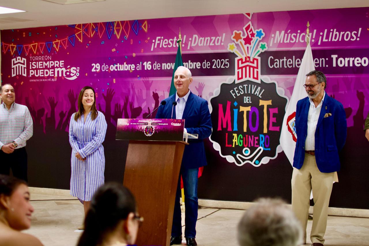 En rueda de prensa, el alcalde Román Alberto Cepeda González presentó el primer Festival del Mitote Lagunero con una inversión de cuatro millones de pesos; las actividades artísticas y culturales serán del 29 de octubre al 16 de noviembre del 2025 en Torreón.