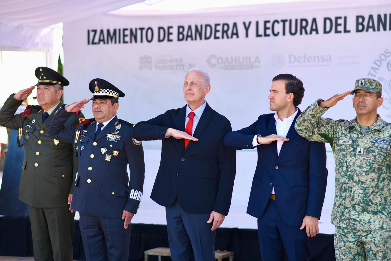 Durante la ceremonia de Izamiento a la Bandera y Lectura del Bando Solemne por el Inicio de las Fiestas Patrias, estuvo Gabriel Elizondo Pérez, coordinador general de Mejora Coahuila, en representación del gobernador Manolo Jiménez Salinas, además, el Alcalde estuvo acompañado de autoridades municipales, estatales y militares.
