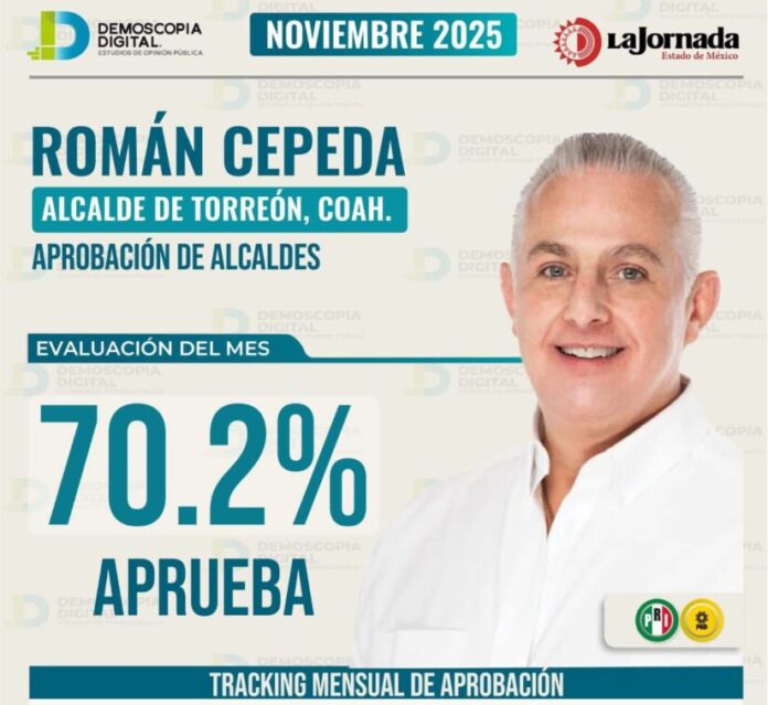El mes de noviembre registró resultados favorables para el alcalde de Torreón. La casa encuestadora Endoscopía Digital dio a conocer los indicadores de aprobación correspondientes a dicho periodo, en los poco más del 70 por ciento de la ciudadanía torreonense manifestó su respaldo a la gestión de Román Cepeda.